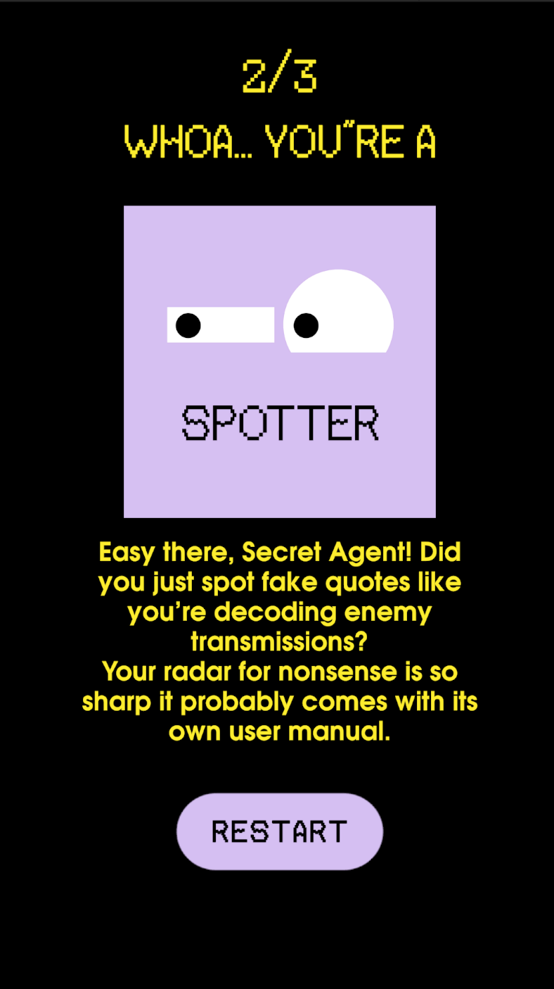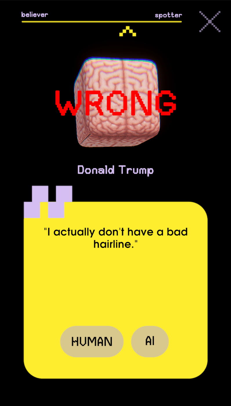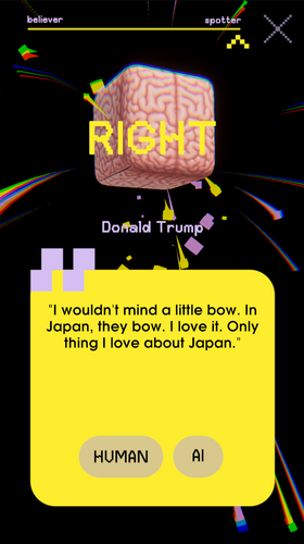 A funny trivia game with quotes from famous people, mixed in with AI generated quotes. Your job? To guess the human and unmask the AI!
